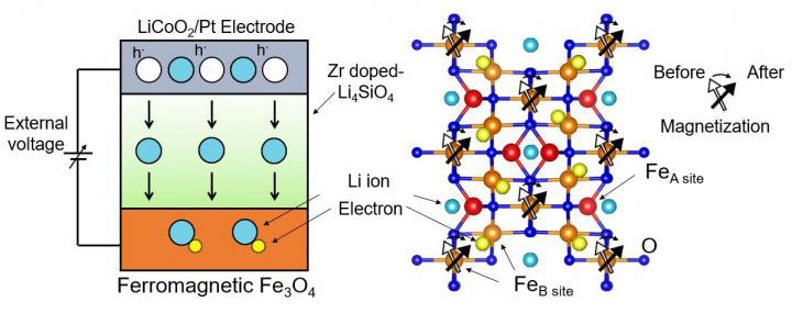 В отличие от прежних попыток управления углом намагниченности, в которых использовали сильные внешние магнитные поля или спиновые токи, новый подход основан на обратимой электрохимической реакции. После приложения внешнего напряжения ионы лития мигрируют из верхнего электрода (оксид литий-кобальта) через электролит в слой магнетита. Ионы внедряются в структуру этого материала, образуя соединение LixFe3O4 и вызывают заметное вращение его угла намагничивания из-за изменений в носителях заряда.